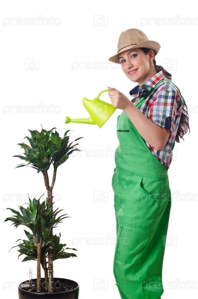 Девушка поливает растения на белом фоне