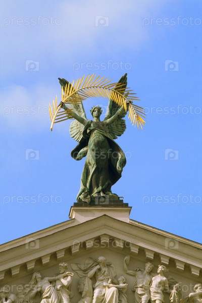 Статуя ангела с золотой пальмовой ветвью на здании, скульптура на фасаде,оперный театр Львова