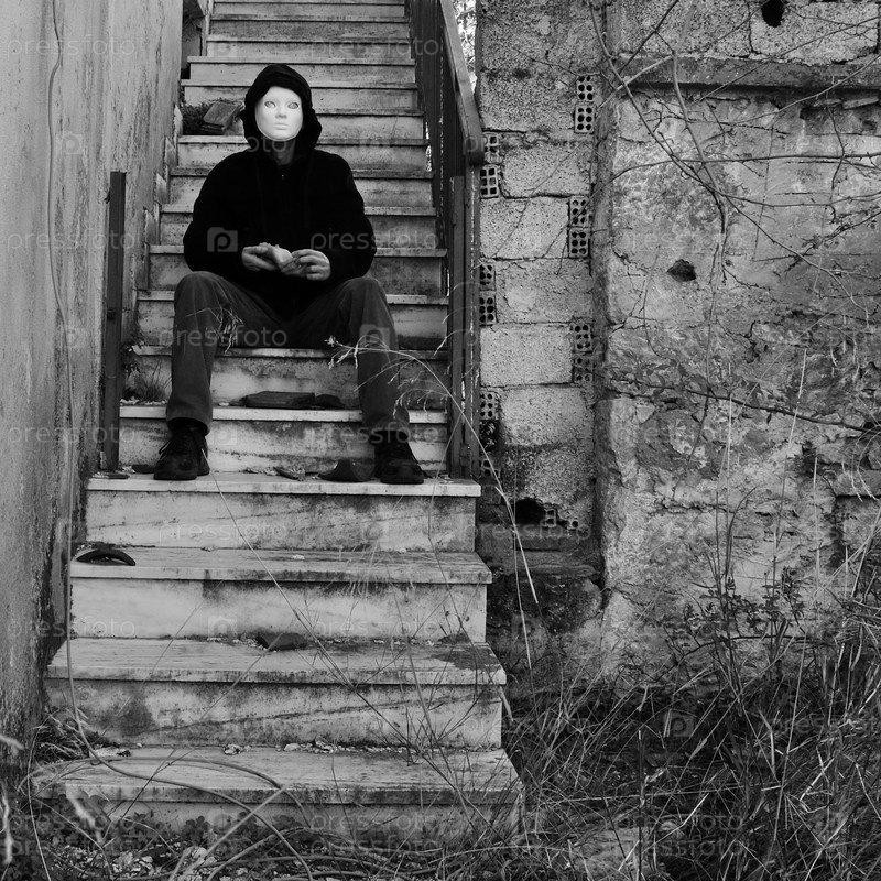 Фигура в маске с рукой куклы сидит на лестнице заброшенного дома. Черно-белое изображение