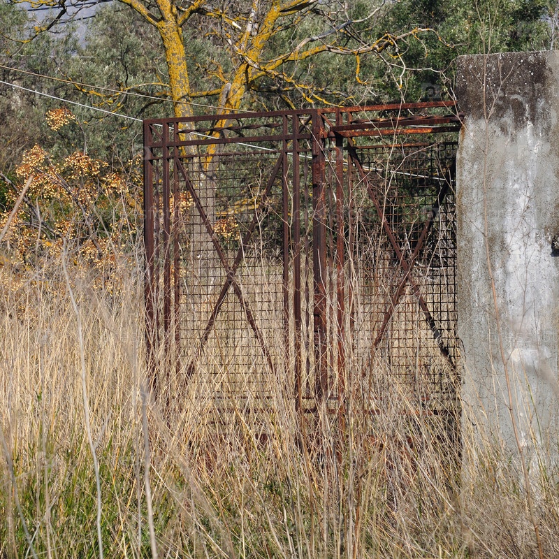 Старые ржавые металлические ворота, заросшие растениями. Руины в сельской местности
