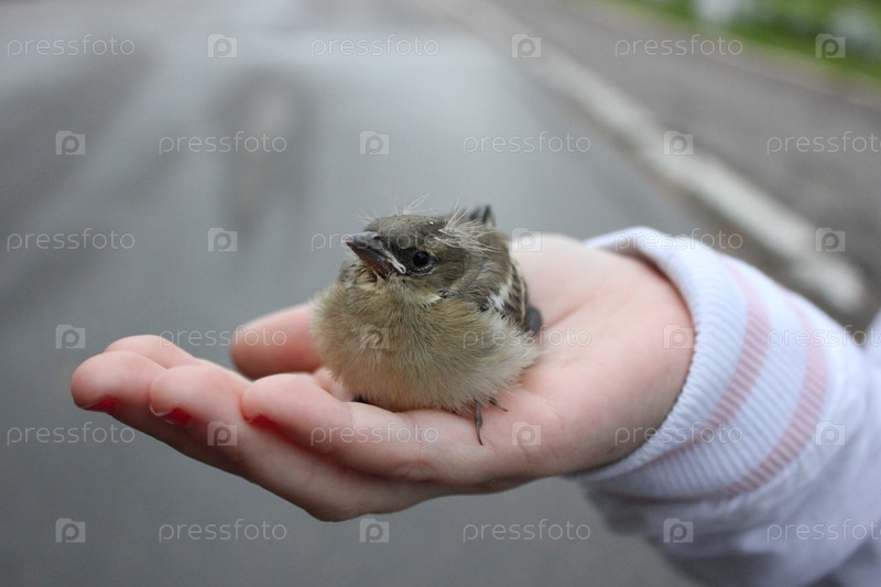 Птенец воробья на детской ладони