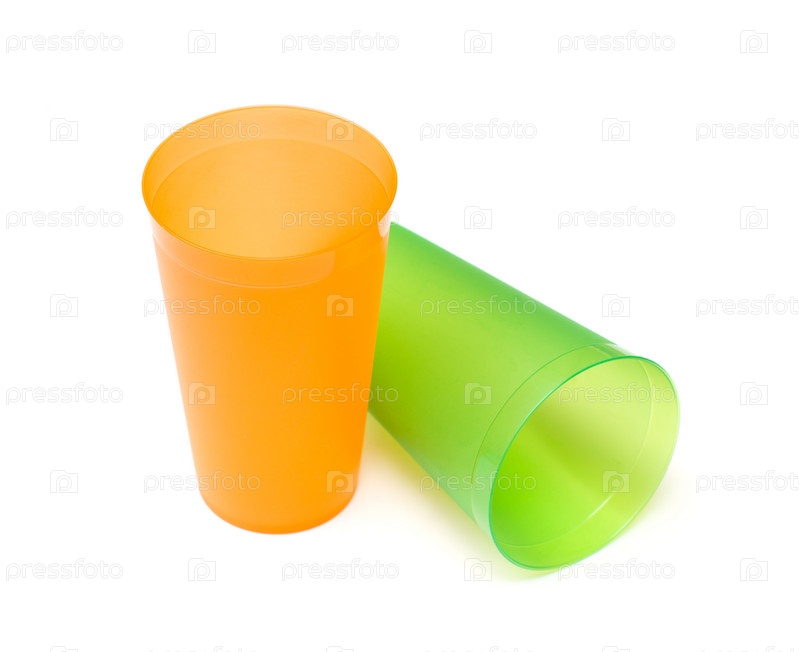 Пластиковые цветные стаканы на белом фоне