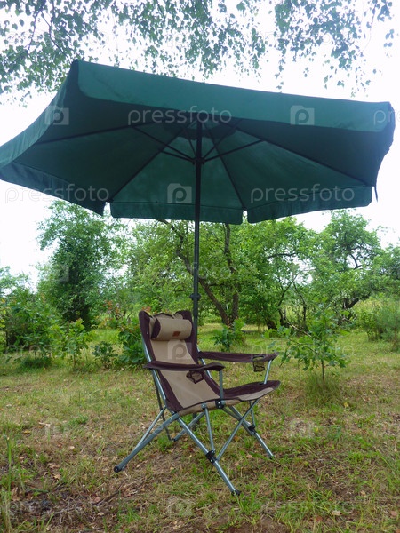 Складное кресло под зонтиком в саду