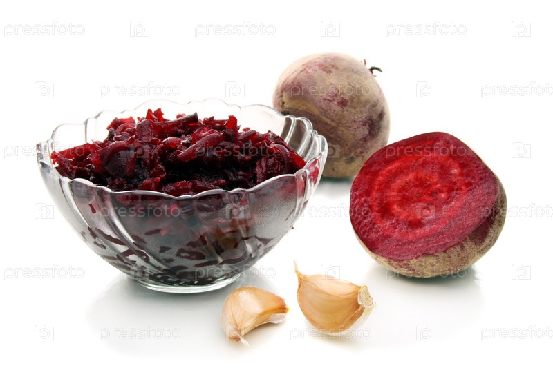 Салат из свеклы с чесноком в стеклянной чаше на белом фоне