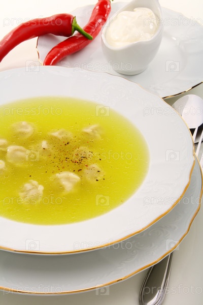 Пельмени с бульоном и красным перцем