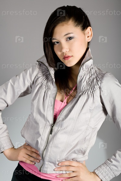 Портрет молодой красивой брюнетки в элегантной одежде на сером фоне