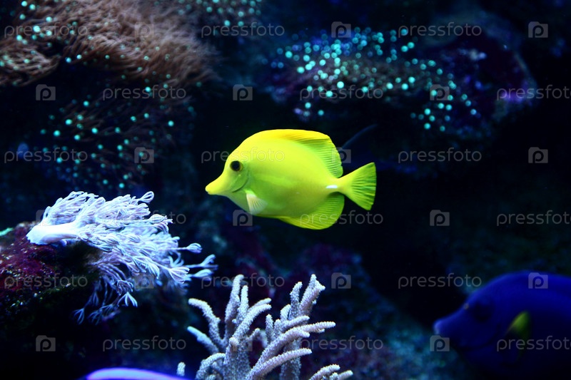 Подводный мир. Желтая рыба на фоне коралла