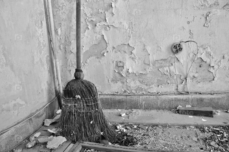 Пыльная соломеная метла на грязном полу заброшенного дома. Черное и белое