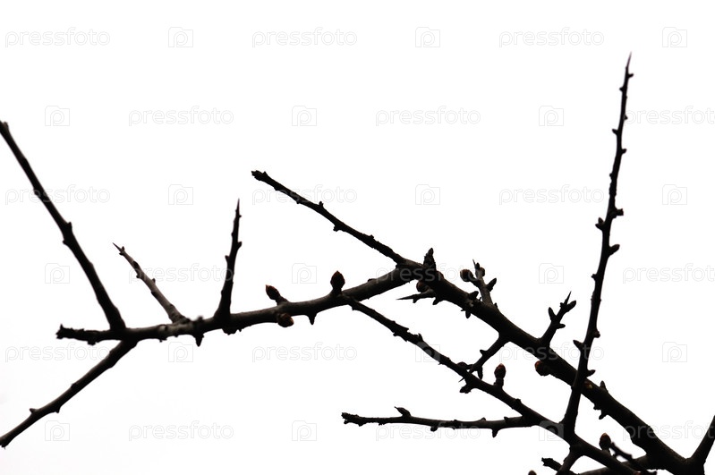 Силуэт голых веток с бутонами на белом фоне. Выборочный фокус