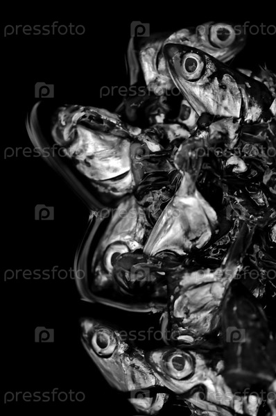 Кучу отрезанных рыбьих голов. Черно-белое изображение