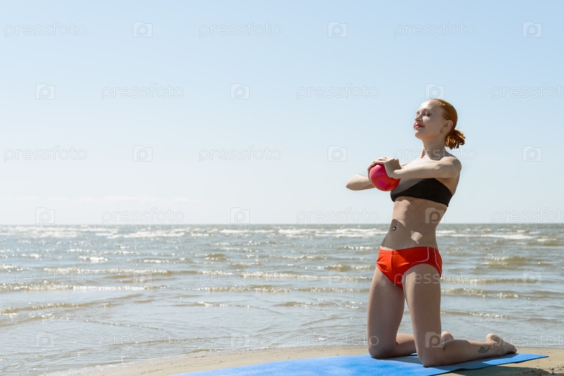 Красивая женщина занимается фитнесом на пляже