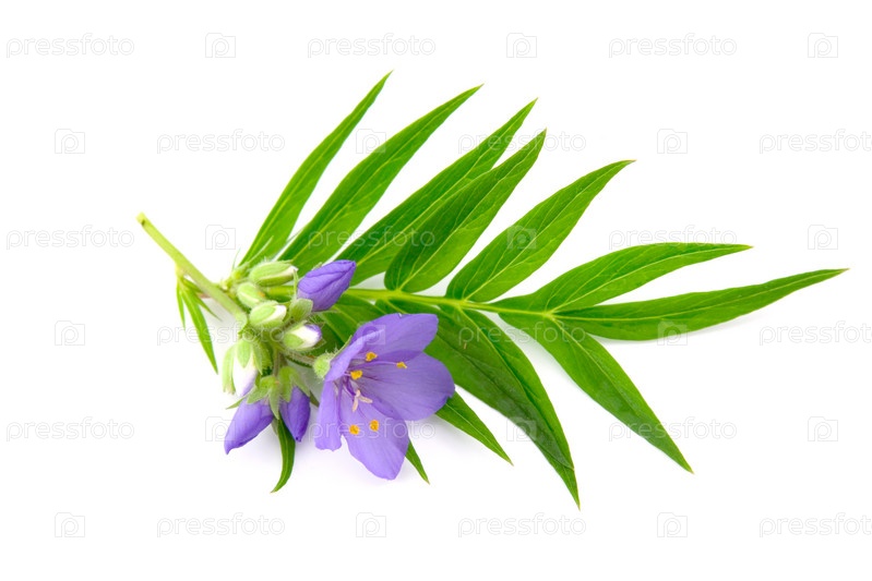 Голубой цветок и листья на белом фоне