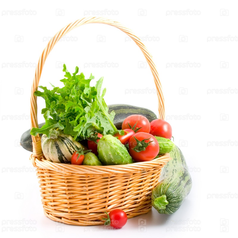 Спелые овощи в корзине на белом фоне