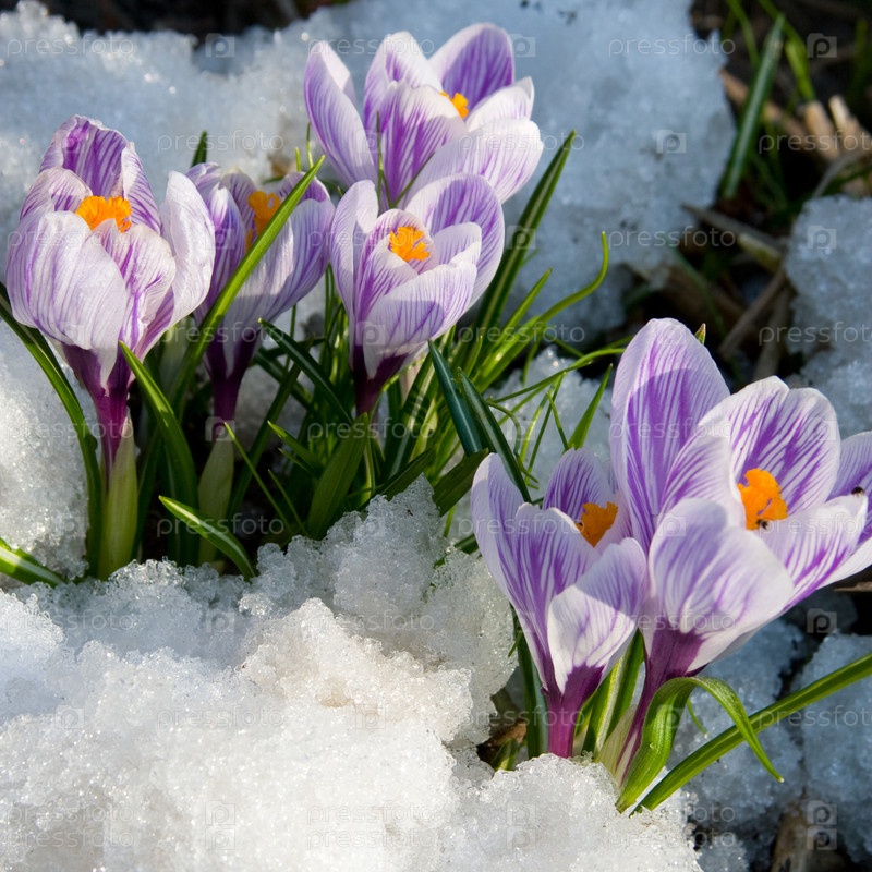 Фиолетовык крокусы в снегу, весенний пейзаж