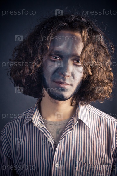 Молодой человек в гриме, с длинными волосами на черном фоне