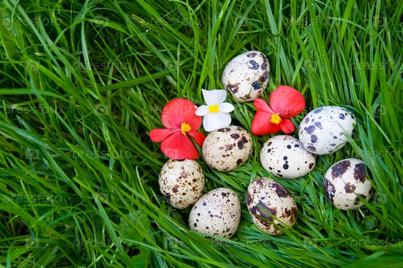 Перепелиные яйца с цветами на зеленой траве