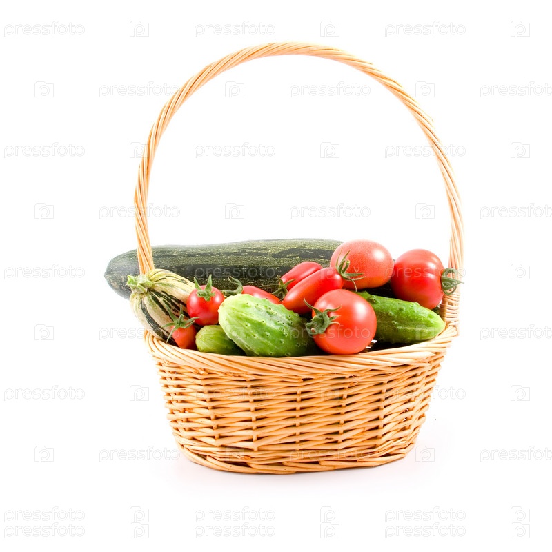 Спелые овощи в корзине на белом фоне