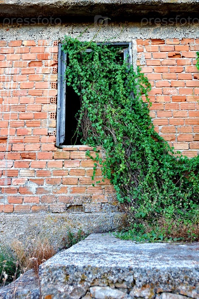 Плющ вьется через окно заброшенного дома
