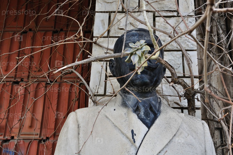 Оскверненная мраморная статуя неизвестного человека за ветками дерева у заброшенного дома