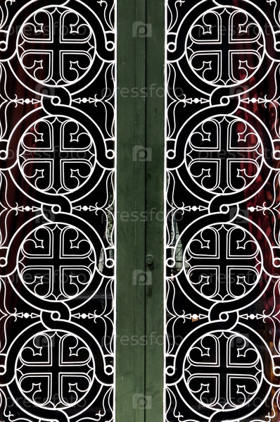 Узор из замысловатых кругов и христианских крестов на железной двери церкви