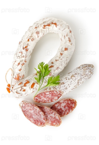 Колбаса салями, изолированная на белом фоне
