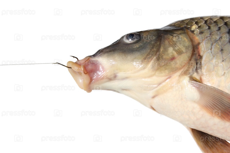 Карп на рыболовном крючке, изолированный на белом