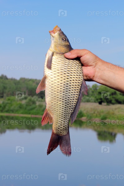 Карп в руке рыбака на фоне неба и реки