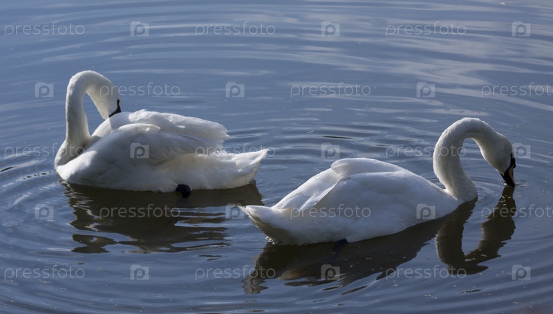 Два белых лебедя ищут еду