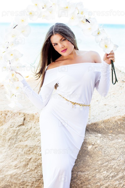 Красивая брюнетка в белом платье позирует на море