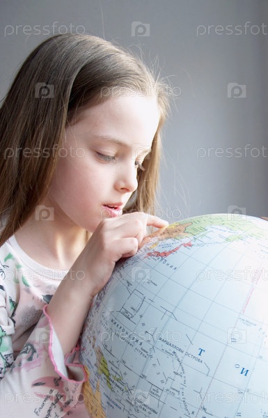 Девочка ищет на глобусе место