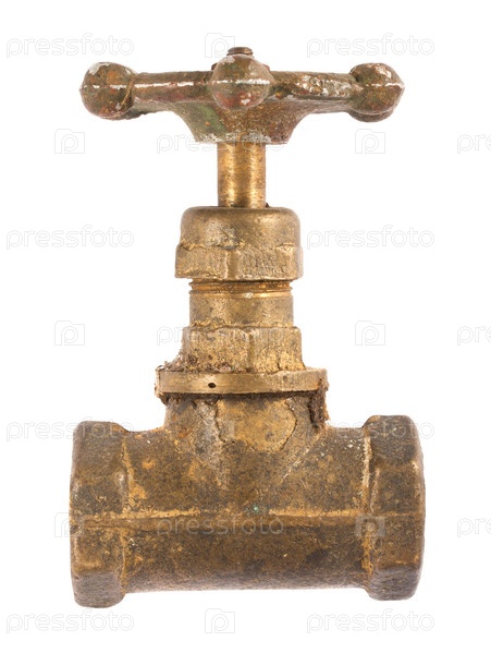 Старый латунный клапан для воды, изолированный на белом фоне