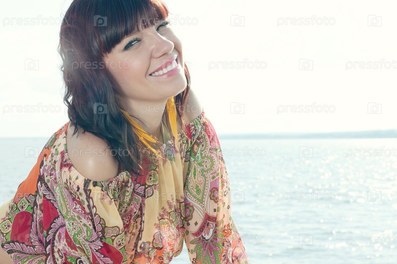 Портрет улыбающейся молодой женщины, наслаждающейся летним отдыхом