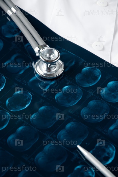 Магнитно-резонансная томография брюшной полости, стетоскоп и ручка