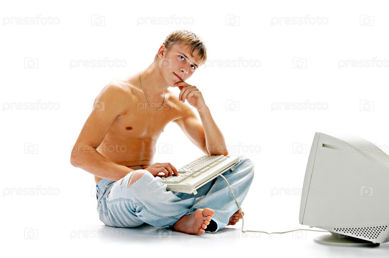 Парень в джинсах с клавиатурой у монитора