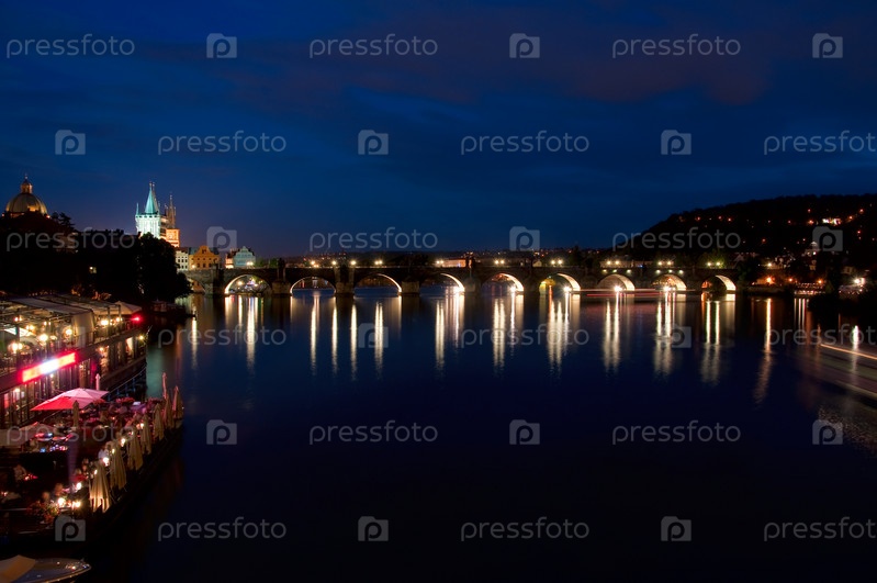 Ночной вид на набережную реки Влтава и Карлов мост в Праге