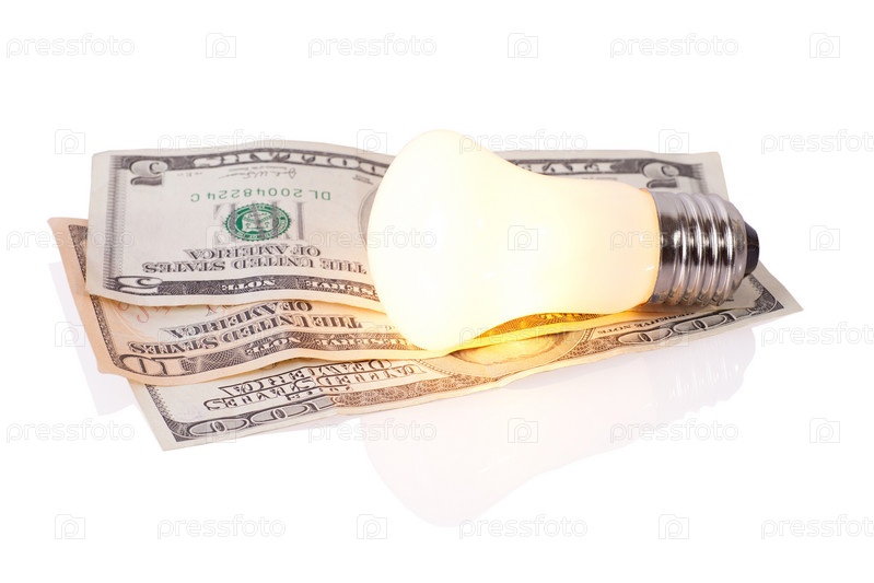Стараяь лампа на долларах на белом фоне