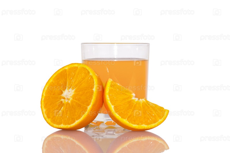Свежий апельсиновый сок и апельсины на белом фоне