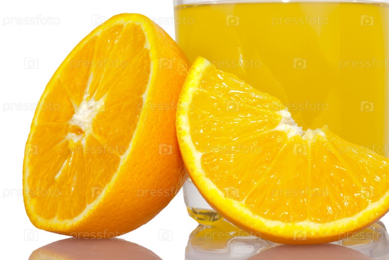 Свежий апельсиновый сок и апельсины на белом фоне