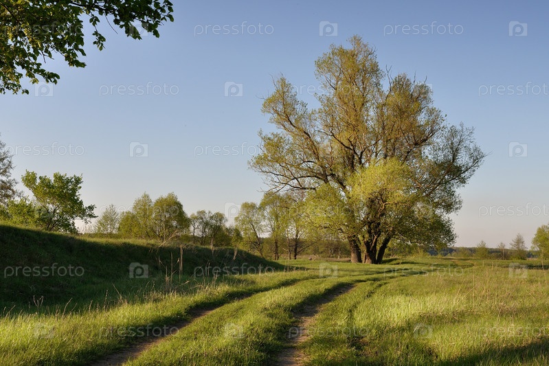 Деревья на лугу на закате