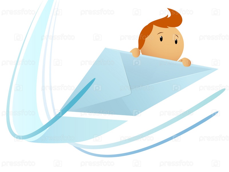 Мультипликационный герой летит на конверте с линиями, изображающими ветер