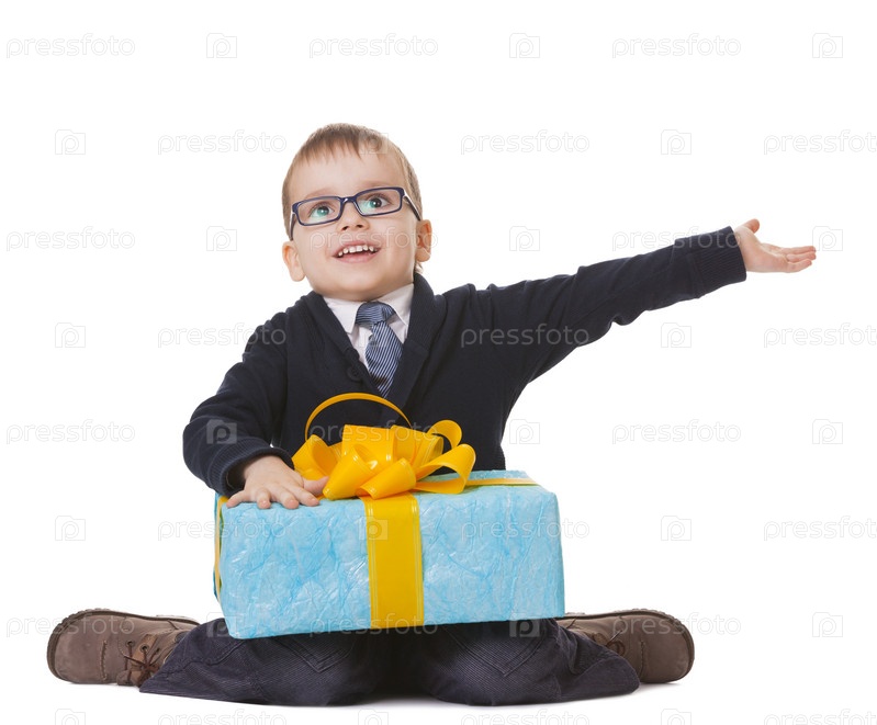 Мальчик в очках с большим подарком на белом фоне