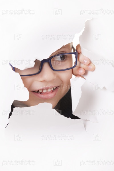 Любопытный мальчик в очках смотрит через отверстие в бумаге