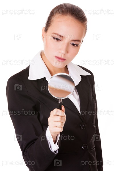 Внимательная бизнес-леди смотрит в увеличительное стекло на белом фоне