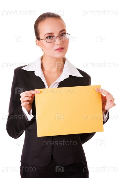 Серьезные молодая женщина в деловом костюме с желтой бумагой
