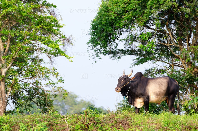 Большой азиатский бык на тропическом пастбище