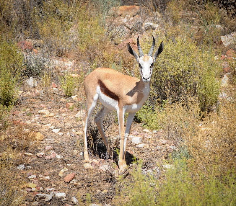 Скачущий антилопа (Antidorcas marsupialis) в кустах, Южная Африка. национальное животное страны