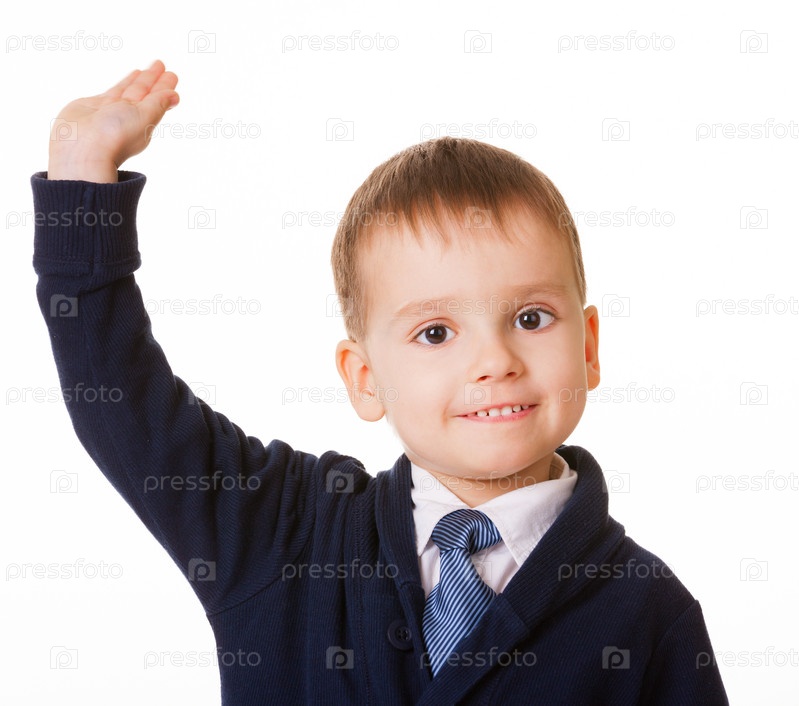 Школьник поднимает руку для ответа, изолированный на белом фоне