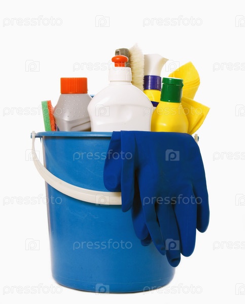 Бутылки моющего средства, щетки, перчатки и губки в ведре