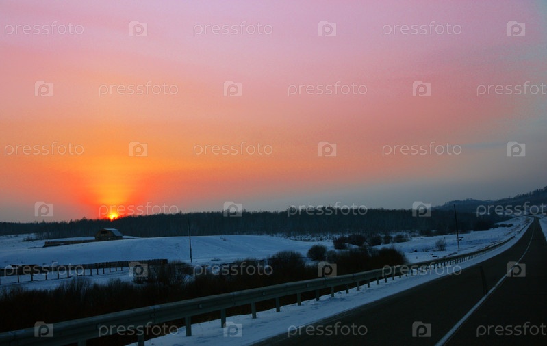 Дом в снегу на фоне заката