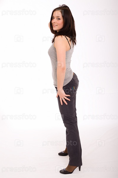 Девушка в сером жилете и черных брюках